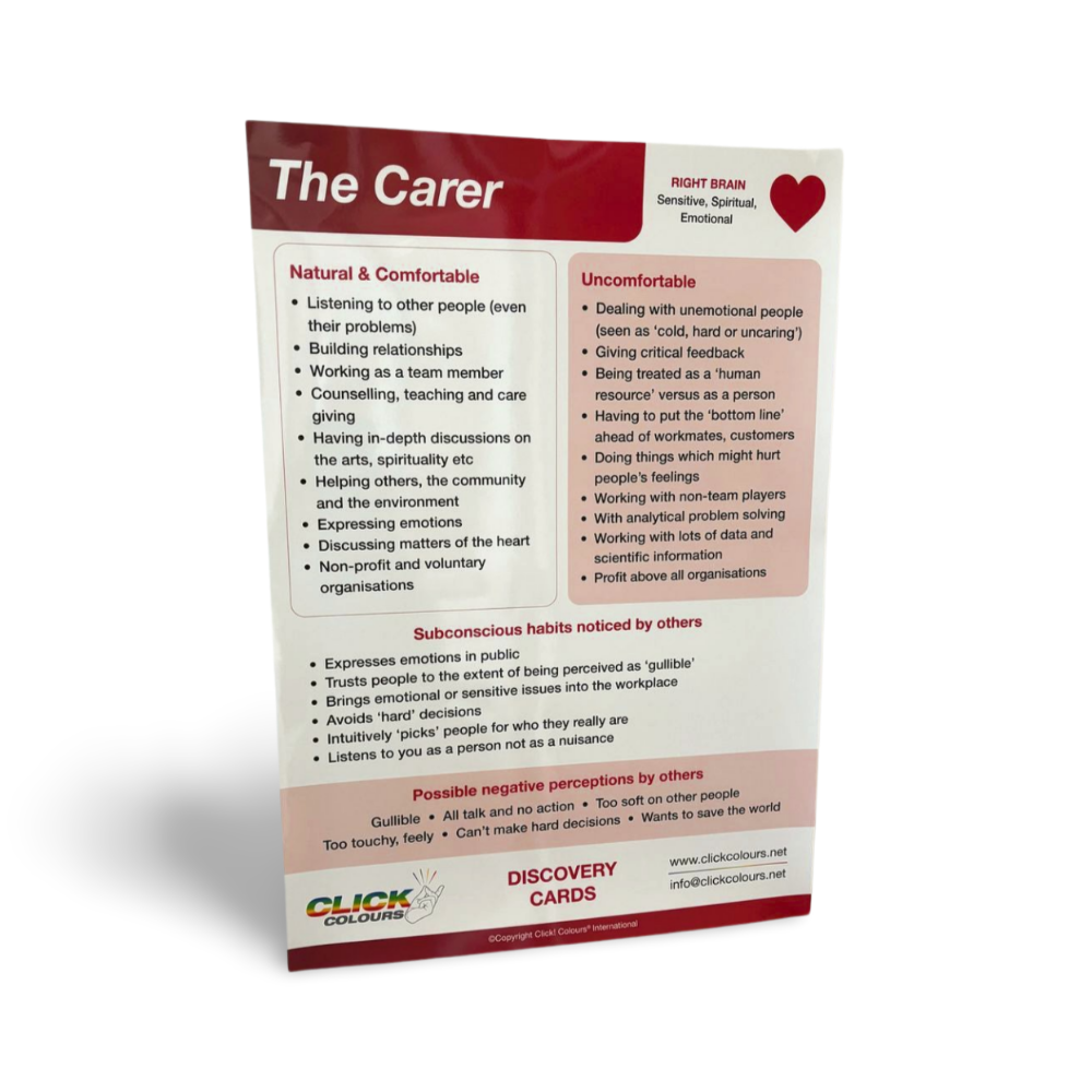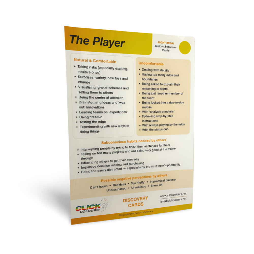 Large, laminated A2 (420mm × 594mm) versions of the Click! Colours Discovery Cards. Great visual reminders of the Click! Colours that will help your people understand and leverage diversity. Use them in your workplace or to run your own Click! Colours Workshops.